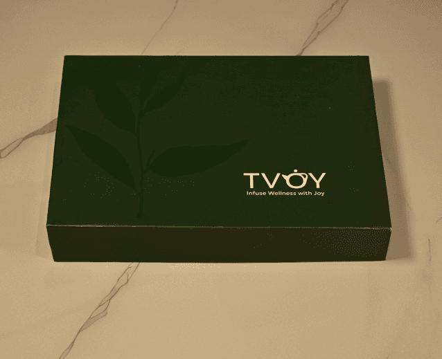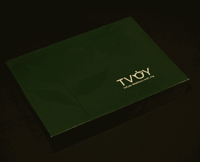 An uitra-modem pleather tea case with handle, designed like a compact suitcase for effortless carrying inside, six compartments hold 90 biodegradable pyramid tea bags of orthodox blend tees from TVOY