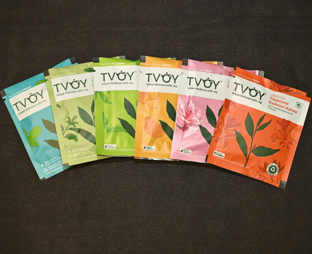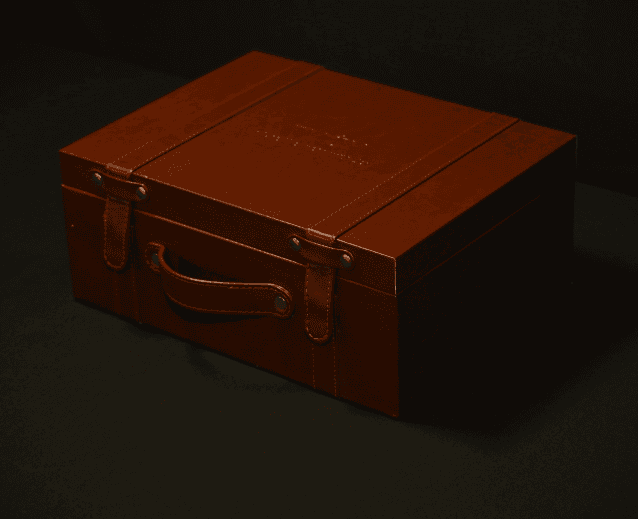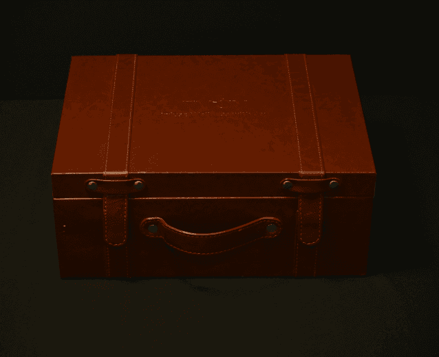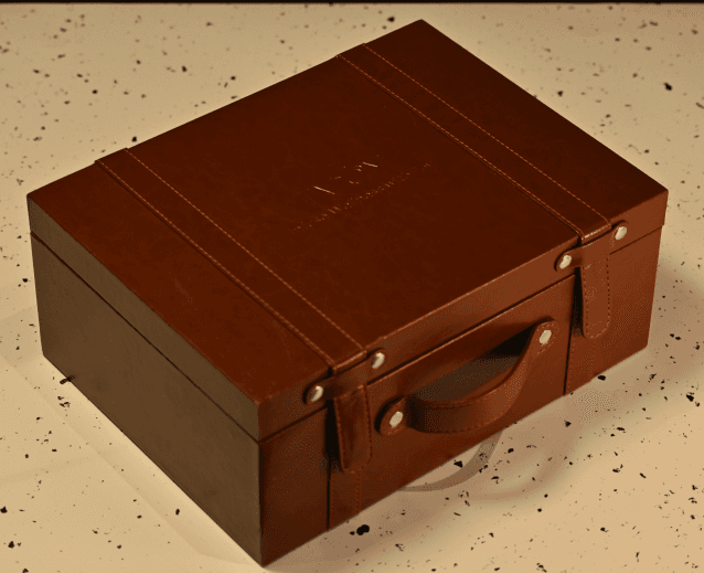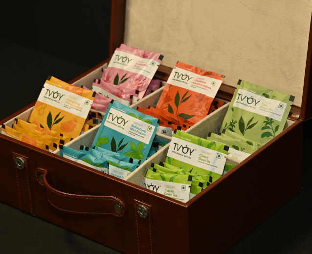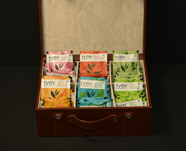 An uitra-modem pleather tea case with handle, designed like a compact suitcase for effortless carrying inside, six compartments hold 90 biodegradable pyramid tea bags of orthodox blend tees from TVOY