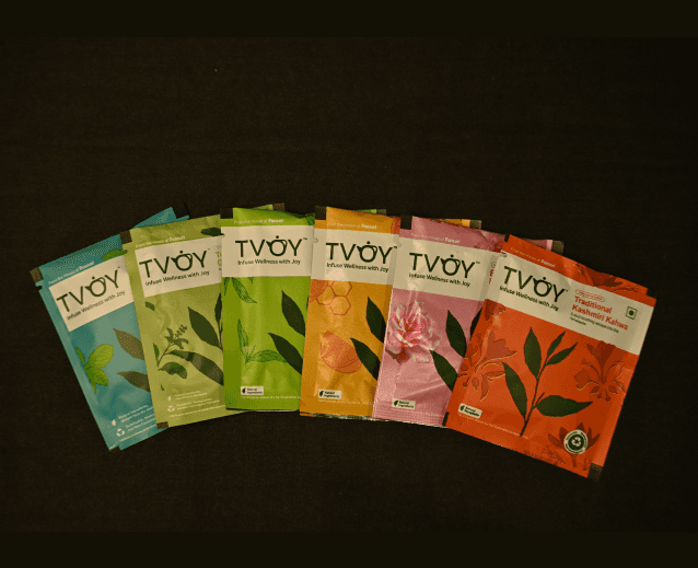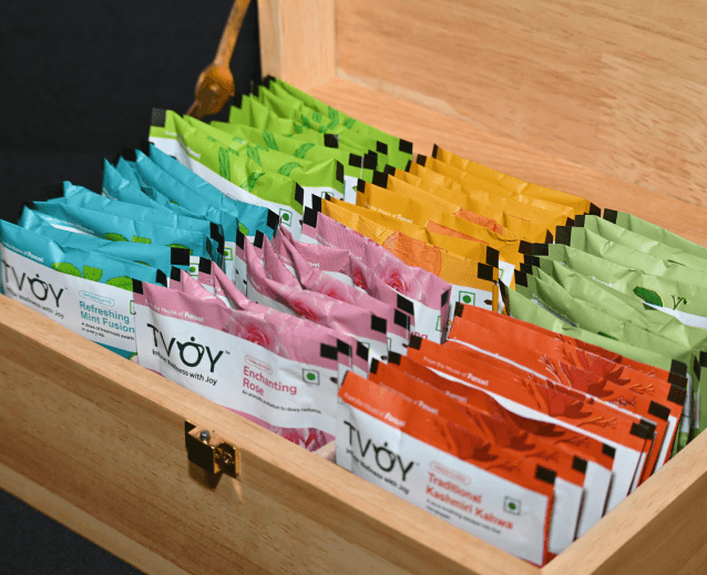 An uitra-modem pleather tea case with handle, designed like a compact suitcase for effortless carrying inside, six compartments hold 90 biodegradable pyramid tea bags of orthodox blend tees from TVOY