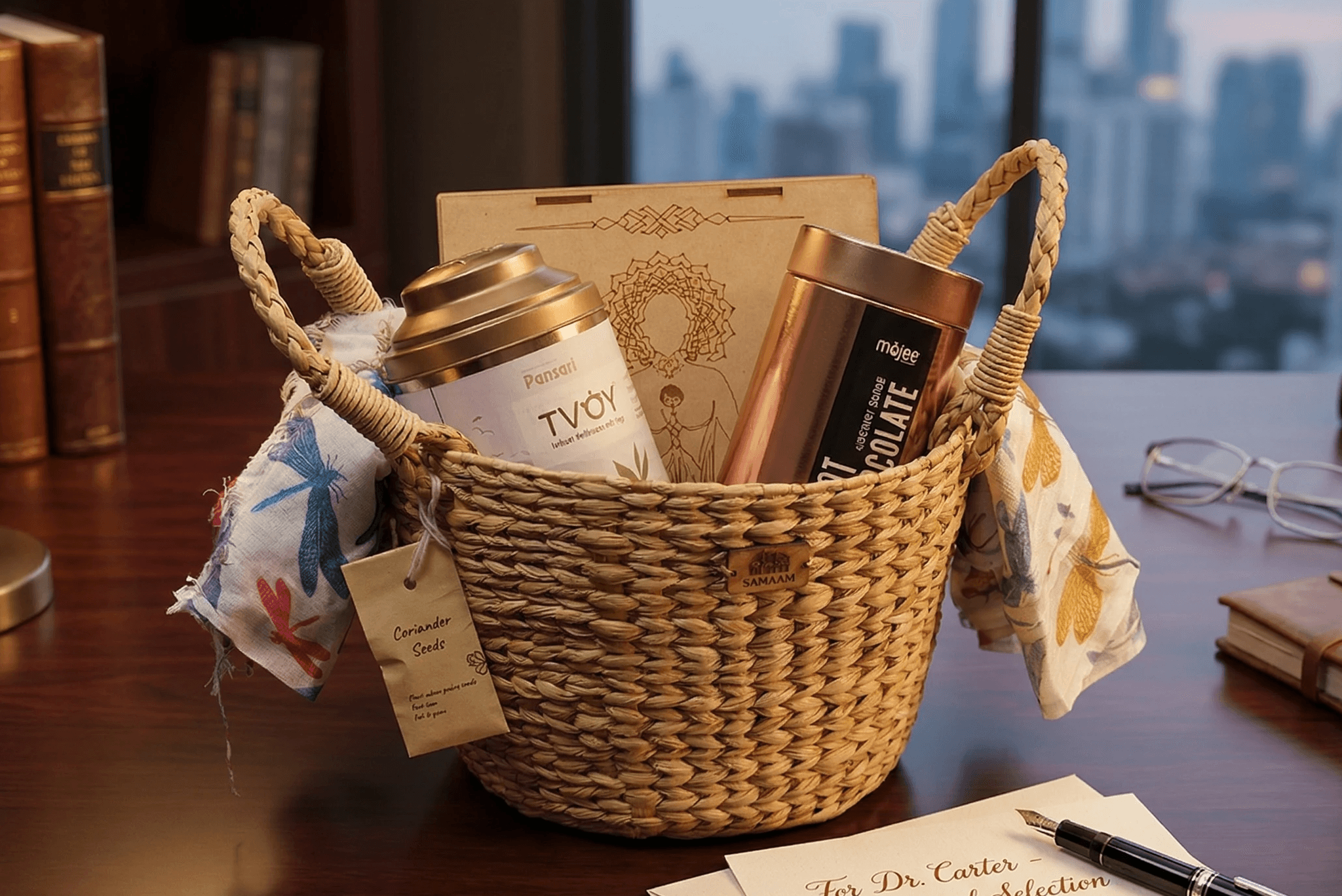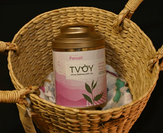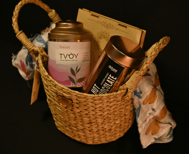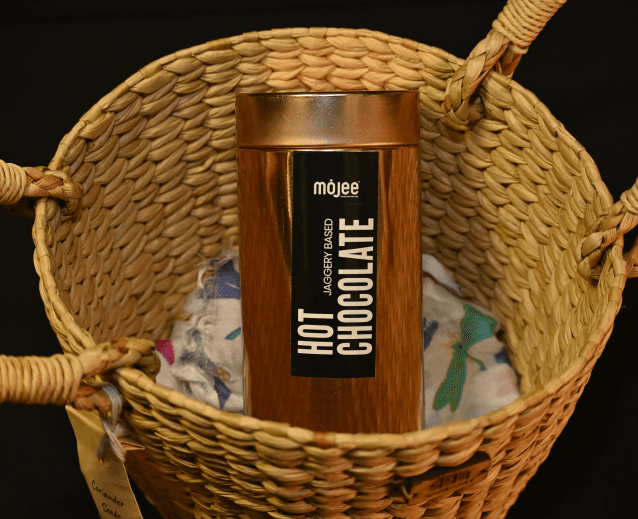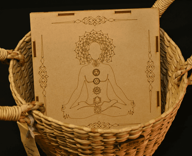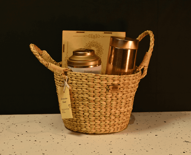 A handwoven Kauna grass basket, naturally suited for humid spaces can be reused as a planter or organiser. The chuskra stones remind us to regain balance Coriander seeds symbolise growth from the smallest beginnings